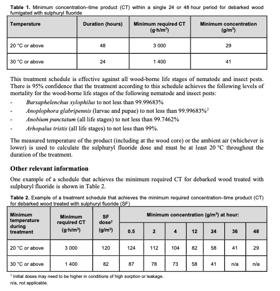 국제 소독처리규정에 아래와 같이 명시 되어 있습니다. (첨부 ISPM28-PT23 원문 참조) <소독처리 주요 사항> 대상 해충: 소나무재선충과 산림해충 약제: 설퍼릴플루오라이드(SF) 방법: 훈증 처리 약량: 농도시간적(CT) 3000 g·h/m³ 이상 달성. (예시, 온도 30°C 이상에서 82g/m³, 24시간 동안 최소 41 g/m³의 농도 유지) * ISPM 28: 국제 식물 보호 협약(IPPC)에 의해 채택된 식물 위생 처리 표준 문서이며, PT 23은 그중 SF의 구체적인 처리 방안을 일컬음 ![]() |